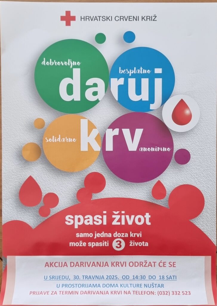 Sukladno Planu akcija prikupljanja krvi u 2025., Gradsko društvo Crvenog križa Vinkovci i Klinički zavod za transfuzijsku medicinu Kliničkog bolničkog centra Osijek će u suradnji s Općinom Nuštar i Aktivom dragovoljnih darovatelja krvi Nuštar provesti akciju dragovoljnog darivanja krvi 30. travnja 2025. (srijeda) od 14:30 do 18 sati u Domu...