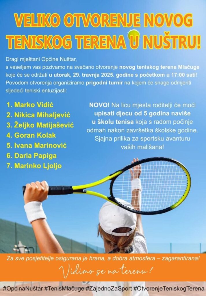 Dragi mještani općine Nuštar, s veseljem Vas pozivamo na svečano otvorenje novog teniskog terena Mlačuge, koje će se održati u utorak, 29. travnja 2025. godine s početkom u 17:00 sati. Na licu mjesta roditelji će moći upisati djecu od 5 godina naviše u školu tenisa koja s radom počinje odmah nakon završetka školske godine. Povodom otvorenja...